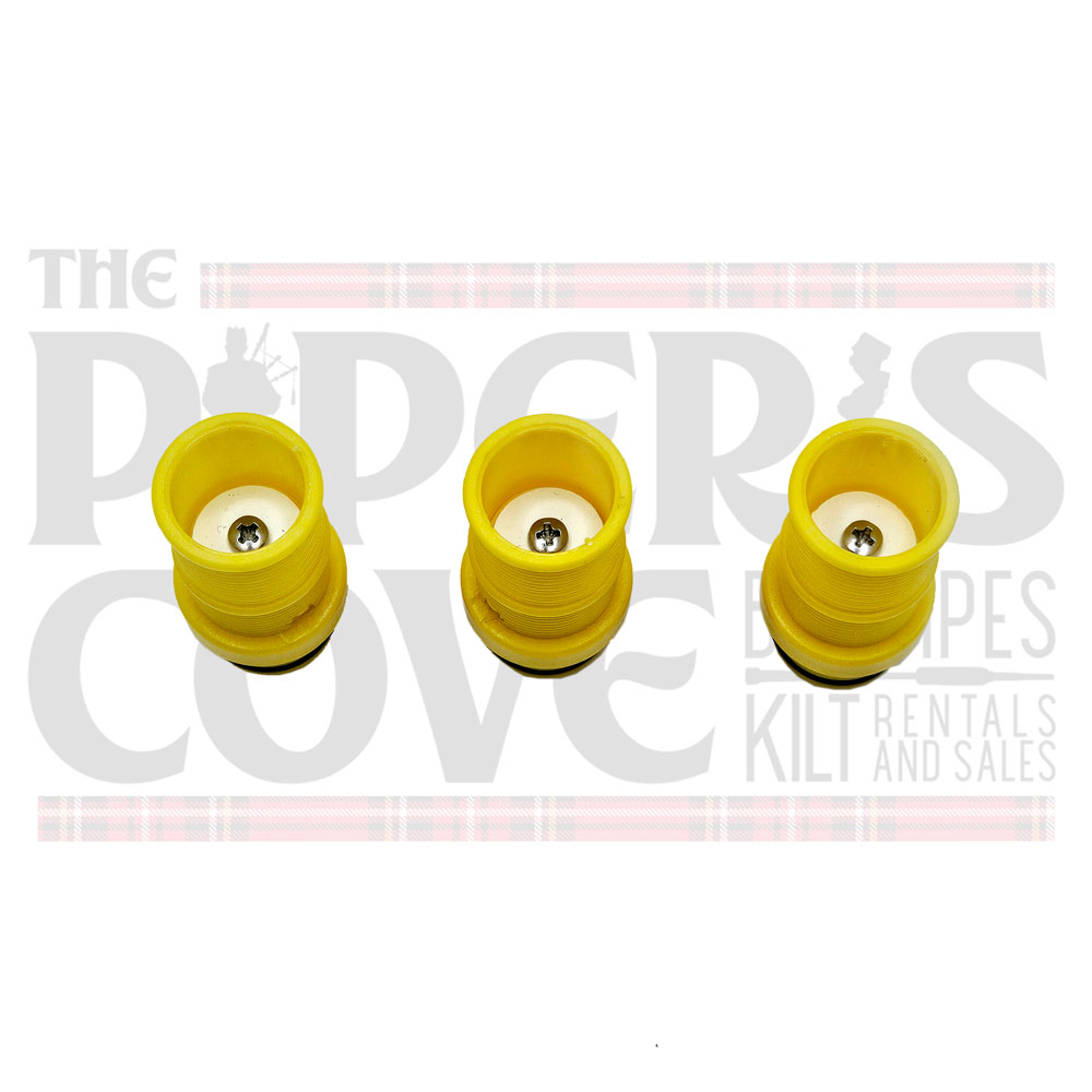 Drone Valves from Highland Reeds – set of three. These drone valves are easily adjustable with a simple screw, which means that they can be personalized to your preferred blowing strength. They work smiliar to a One-Way valve for drones, but offer resistance to limit the amount of air reaching the drones. It is extremely important to set your drone reeds to take less air since they will be receiving less.